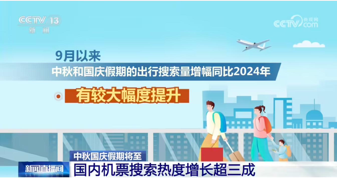 【环球网科技综合报道】9月15日消息,随着2025年国庆、中秋双节假期日益临近,国内旅游市场持续升温,民航出行预订迎来高峰。据央视新闻报道,截至目前,假期出行的国内机票近一周搜索热度同比增长超30%,民众出游与探亲需求逐步释放,各类特色旅游主题备受关注。