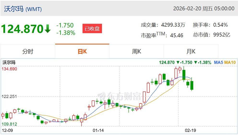 2月19日,美股三大指数收盘全线下跌。亚马逊最新收报204.86美元/股,涨0.03%,最新总市值2.199万亿美元;沃尔玛最新收报124.87美元/股,跌1.38%,最新总市值9952亿美元。